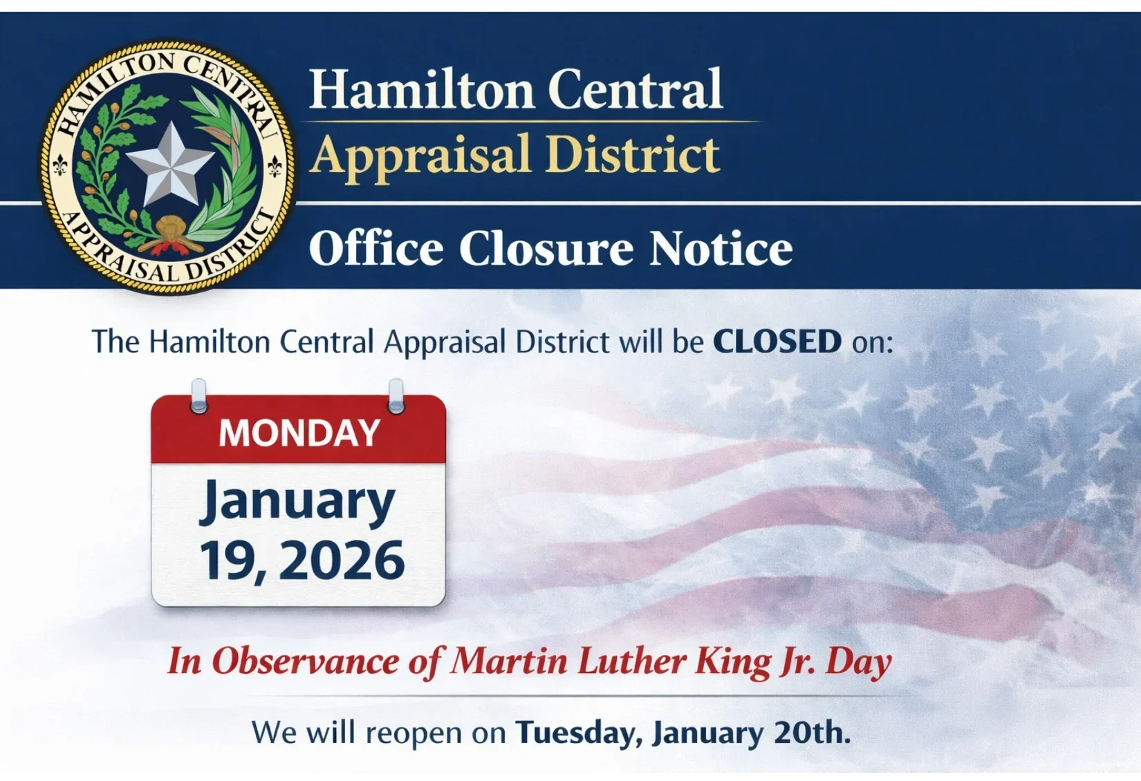 The Hamilton Central Appraisal District Board of Directors will hold the 2026 Budget Hearing August 29th at 9 am. The hearing will be held during the regular BOD meeting at 401 E Main St, Hamilton Texas.